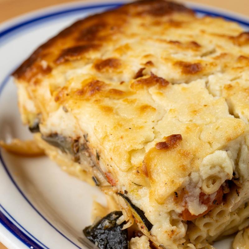 Eggplant,potato, and chopped meat with bechamel. Served with dinner Greek salad, and pita bread